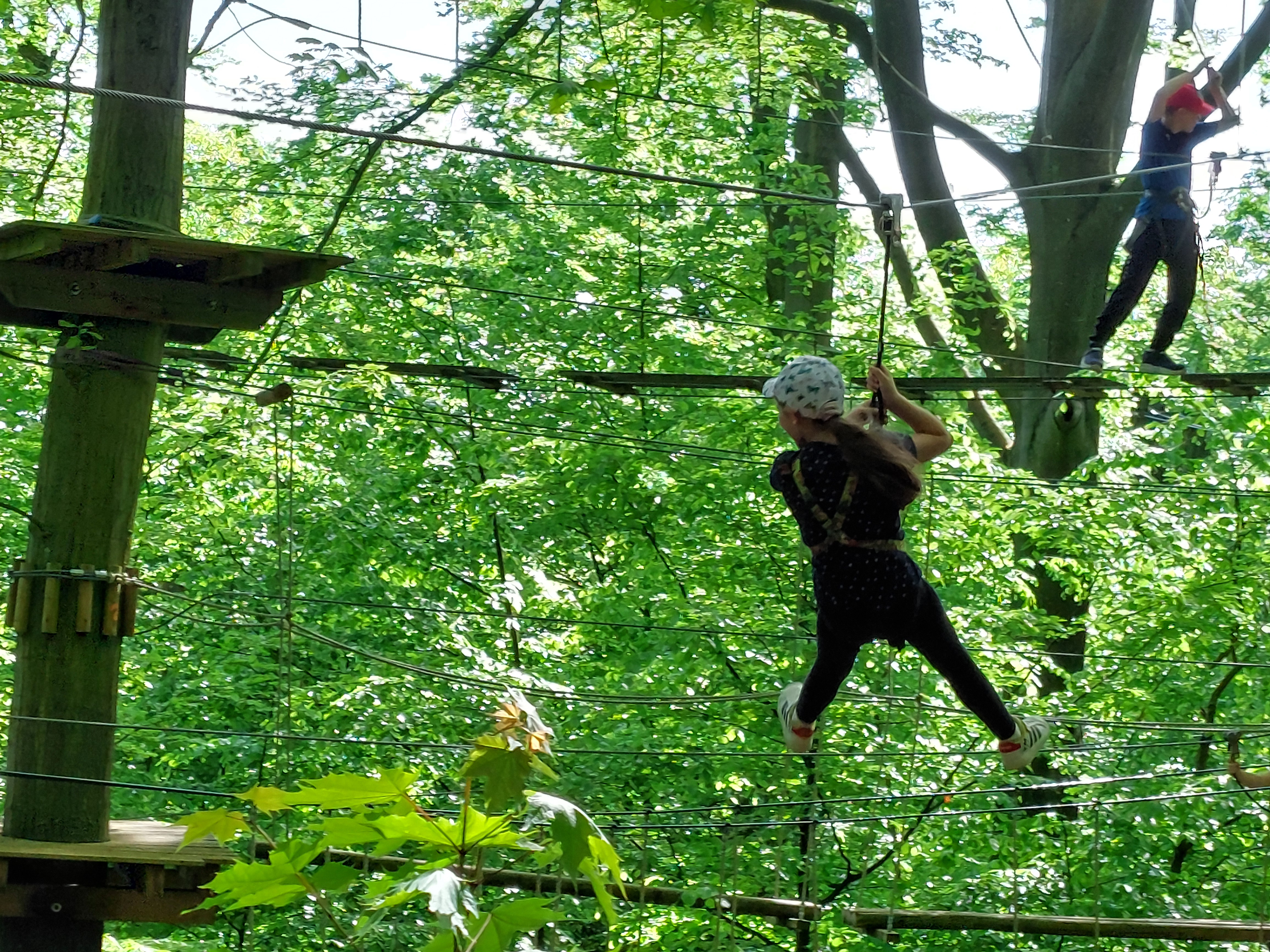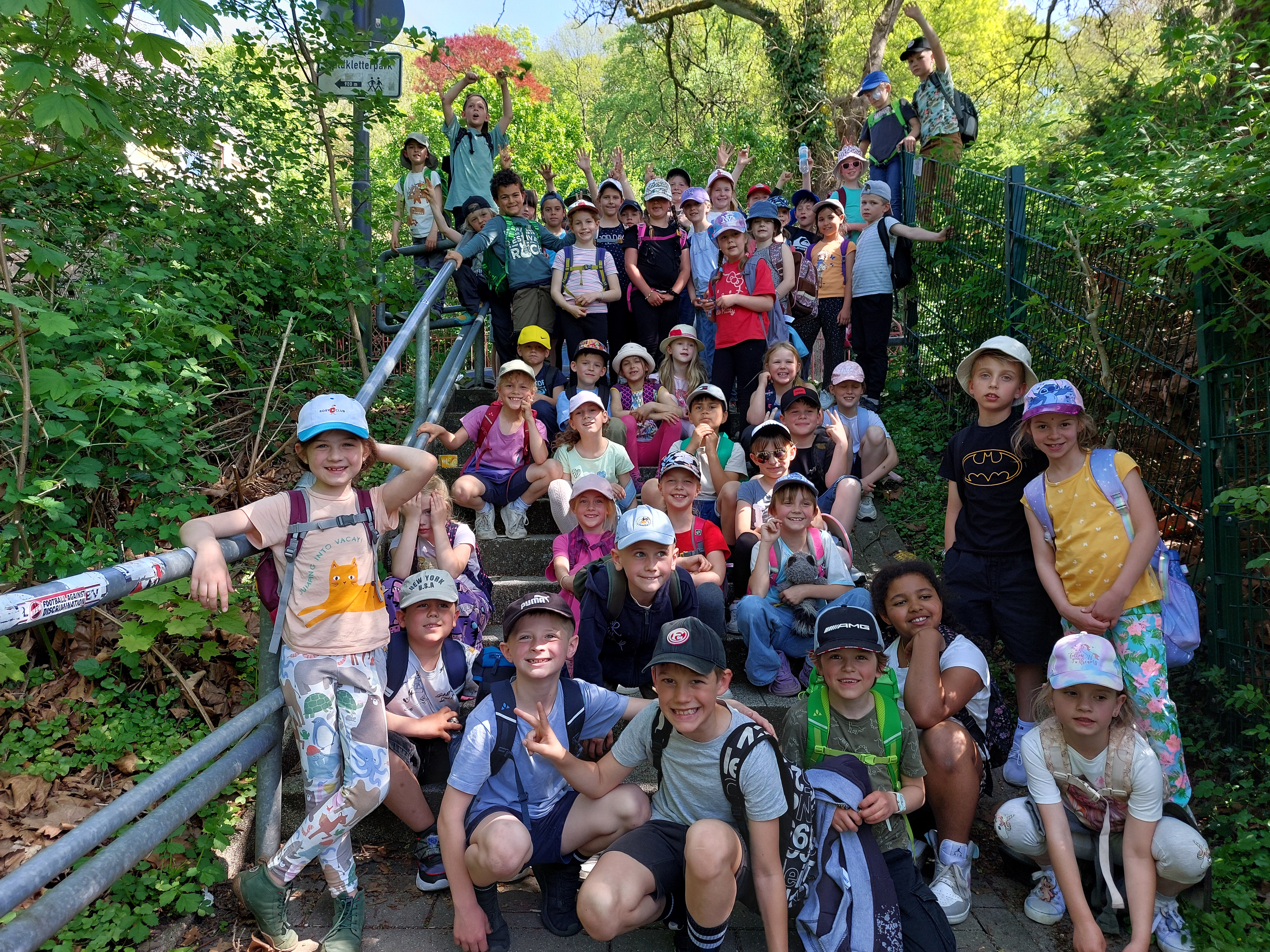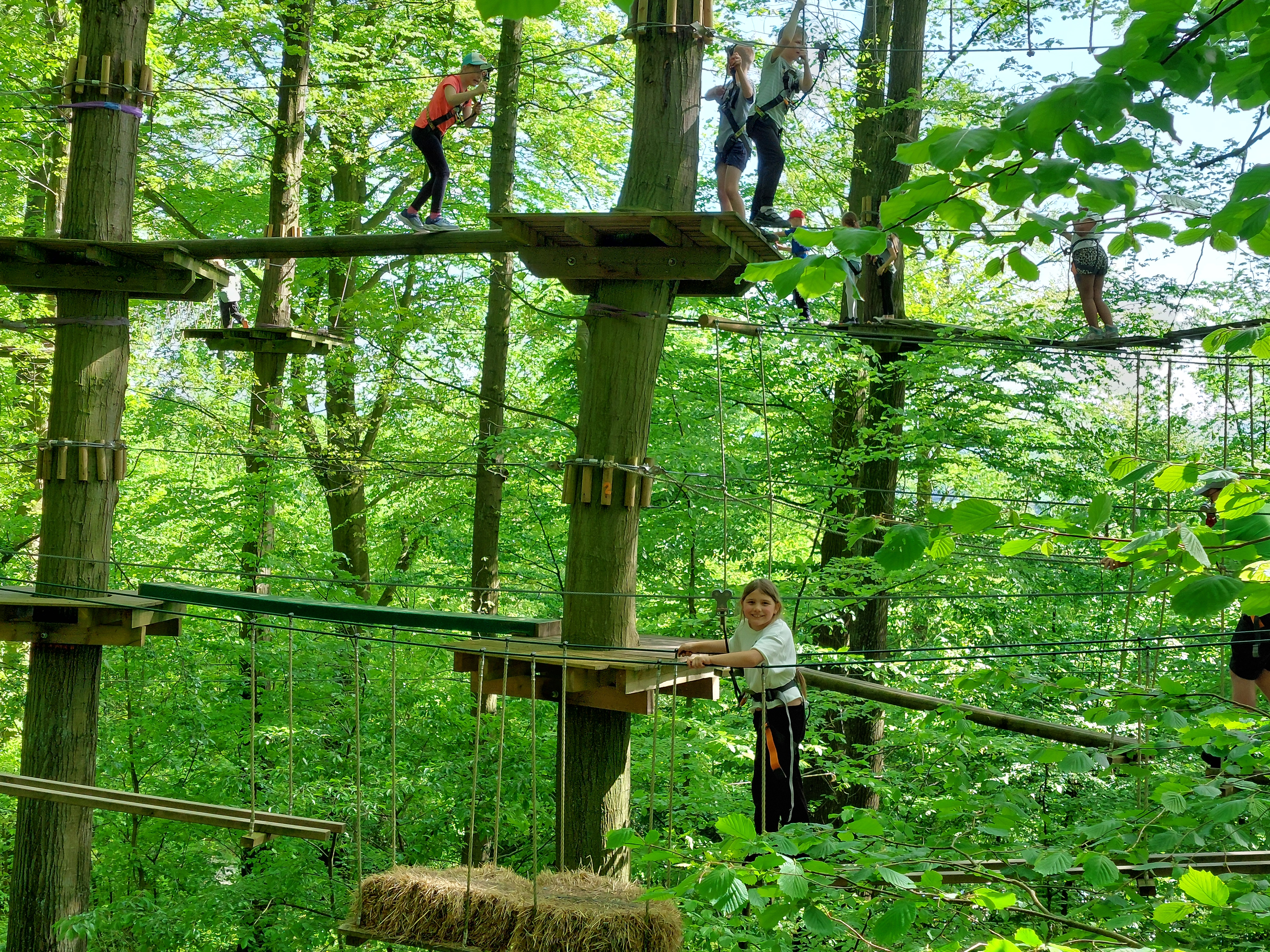 Für unsere zweiten Klassen ging es Ende April auf Klassenfahrt nach Velbert. Einen Tag und eine Nacht verbachten die Erdmännchen und Waschbären getrennt von zu Hause. Es hat richtig viel Spaß gemacht. Nach der Ankunft wurden zuerst mal die Betten bezogen, gemeinsam Mittag gegessen und dann ging es mit dem Bus nach Velbert Langenberg in den Kletterwald. Je nach Lust und Laune konnten die Kinder unterschiedliche Kletterparcours bewältigen. Die Kletterpartie wurde oft mit einem Freiflug entlang der Bäume gekrönt. Abends wurde dann noch eine Nachtwanderung gemacht und die Erdmännchen und Waschbären fielen nach einer Gute-Nacht-Geschichte müde ins Bett. Am nächsten Tag ging es nach dem Frühstück schon wieder nach Hause. Es war ein toller Trip mit viel Action, Spaß und guter Laune.