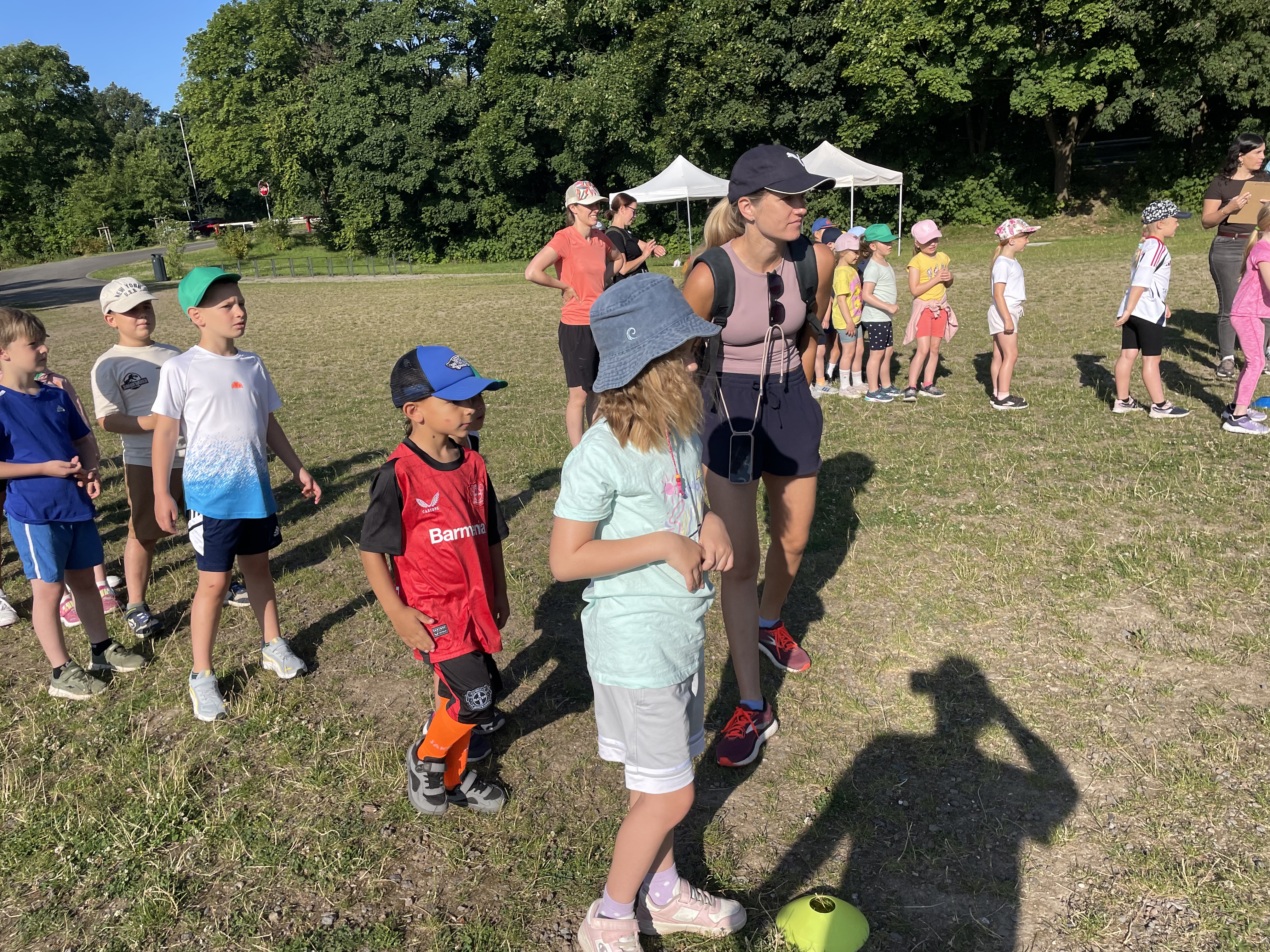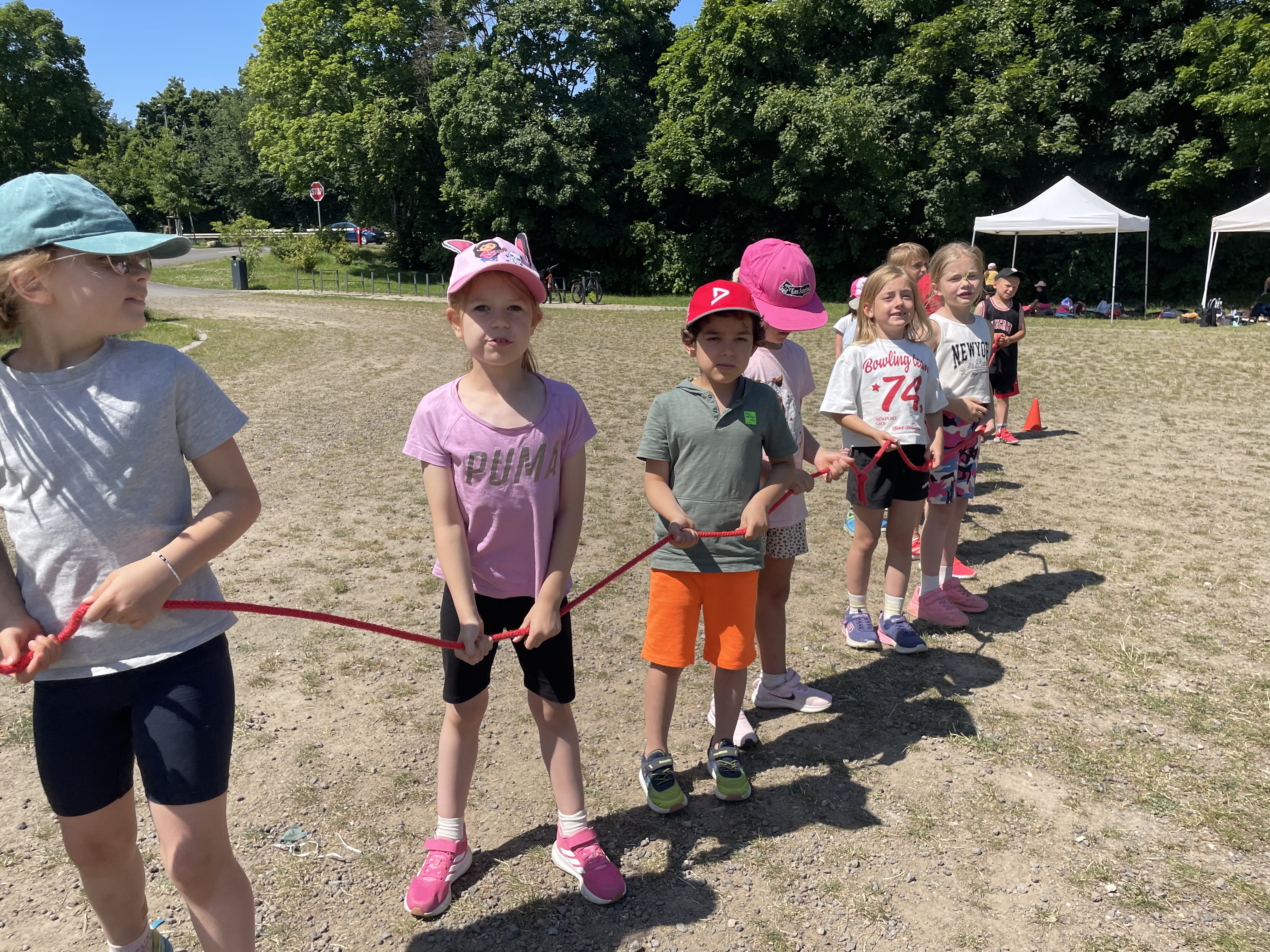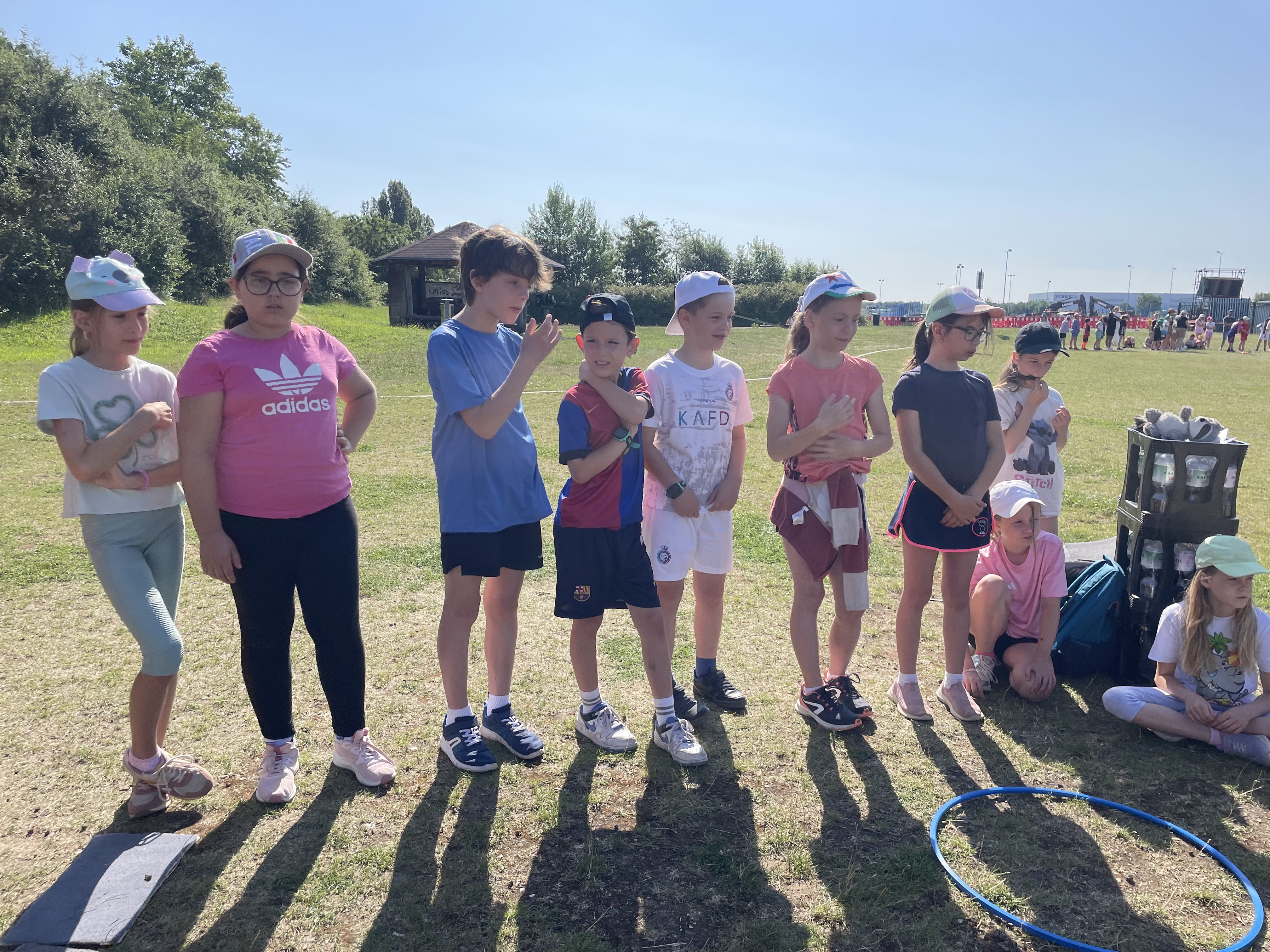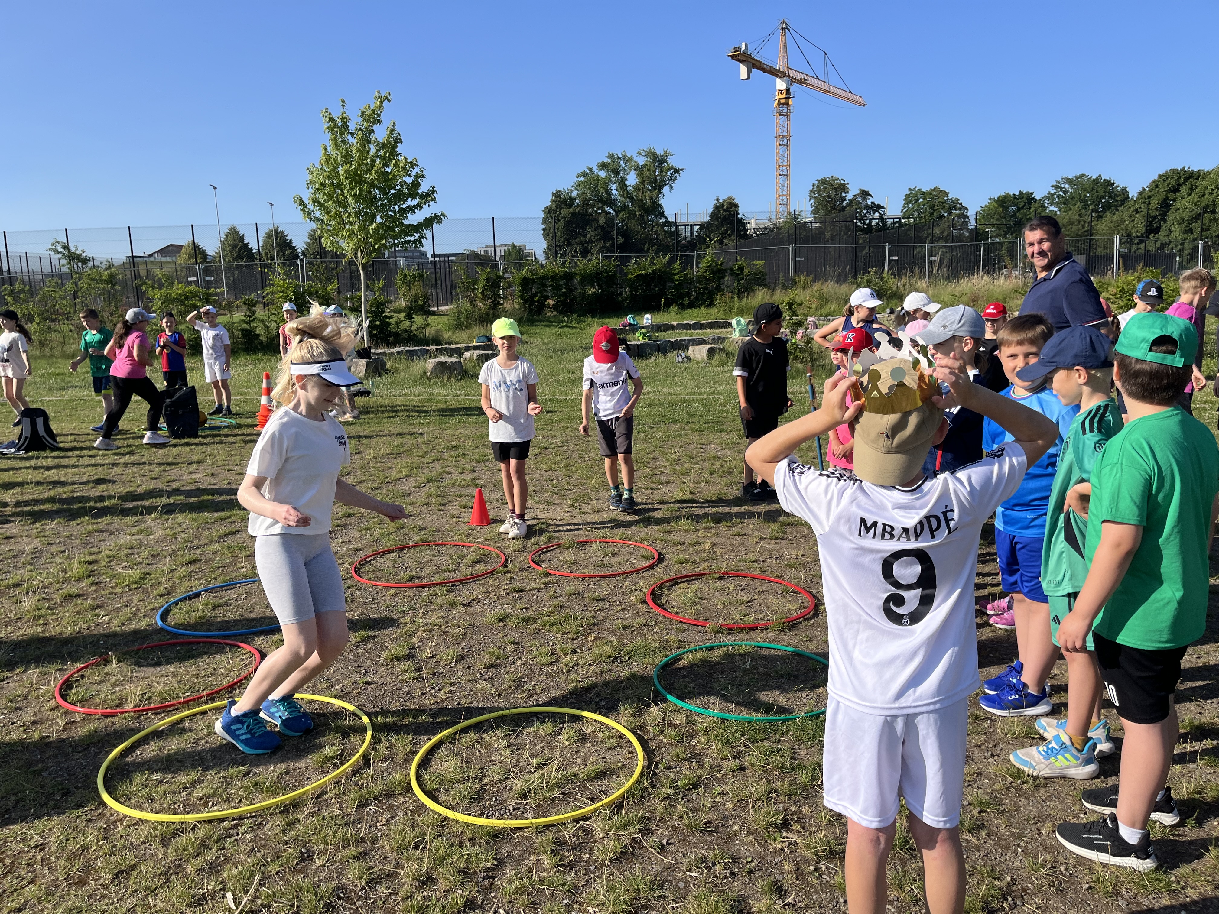 An einem schönen, sonnigen Freitag im Juni trafen sich die Kniprodinis auf dem Schulhof für das diesjährige Sportfest unter dem Motto: „Höher, schneller, weiter – im Team sind wir stark.“ Sie versammelten sich nicht in ihren Klassen, sondern in jahrgangsgemischten Gruppen. Nach einer kurzen Kennenlernrunde in der Gruppe und einer Begrüßung durch Frau Hibel ging es dann los zur Bürgerwiese. Dort angekommen, wurden die Stationen, die die fleißigen Sportlehrer*innen und Eltern geplant und aufgebaut hatten, bestaunt. Die Gruppen suchten sich gemeinsam einen Pausenplatz und es ging los mit einem Aufwärmprogramm. Nicht mehr lange warten, und schon begannen die Spiele. Mit viel Power und Teamgeist spielten die Gruppen gegeneinander Wurfstaffel, Zielwerfen, Dosengolf und Froschsprung. Das war ganz schön anstrengend und die Kniprodinis mussten sich danach in der Pause erst einmal richtig stärken. Im Anschluss ging es in die zweite Runde der Spiele: Ausdauerlauf, Flaschentransport, Schubkarre und Ballstaffel standen auf dem Programm. Die Temperaturen stiegen an und es wurde schon etwas beschwerlicher. Jedoch ließen sich die Kniprodinis nicht aus dem Konzept bringen: Mit Teamgeist, gegenseitigem Anfeuern und Bejubeln meisterten alle Gruppen die Spiele. Zum Schluss ging es müde, aber glücklich zur Schule zurück. Eine Gewissheit steht fest: Die Kniprodinis haben das Motto des Sportfestes definitiv eingehalten.