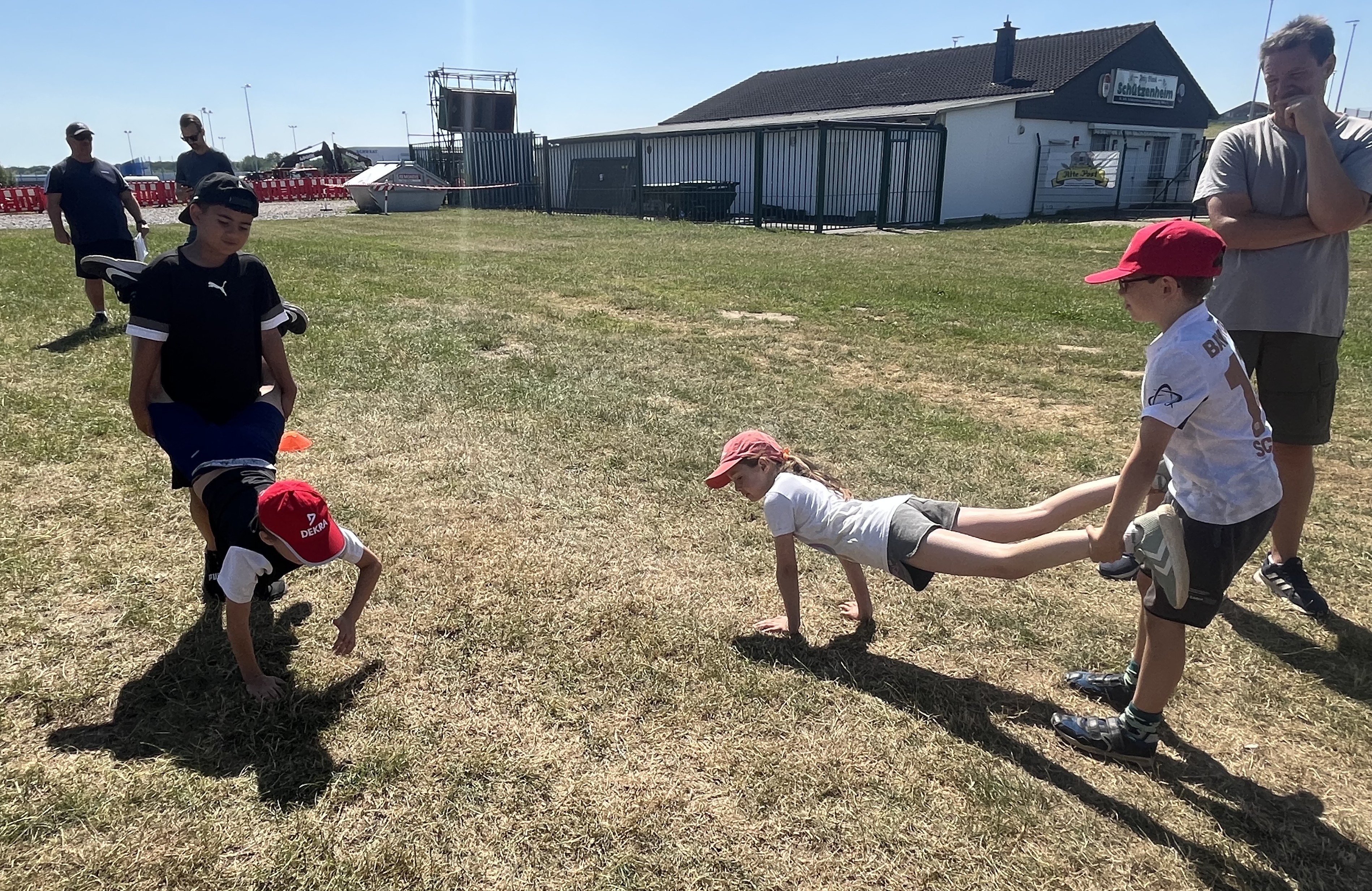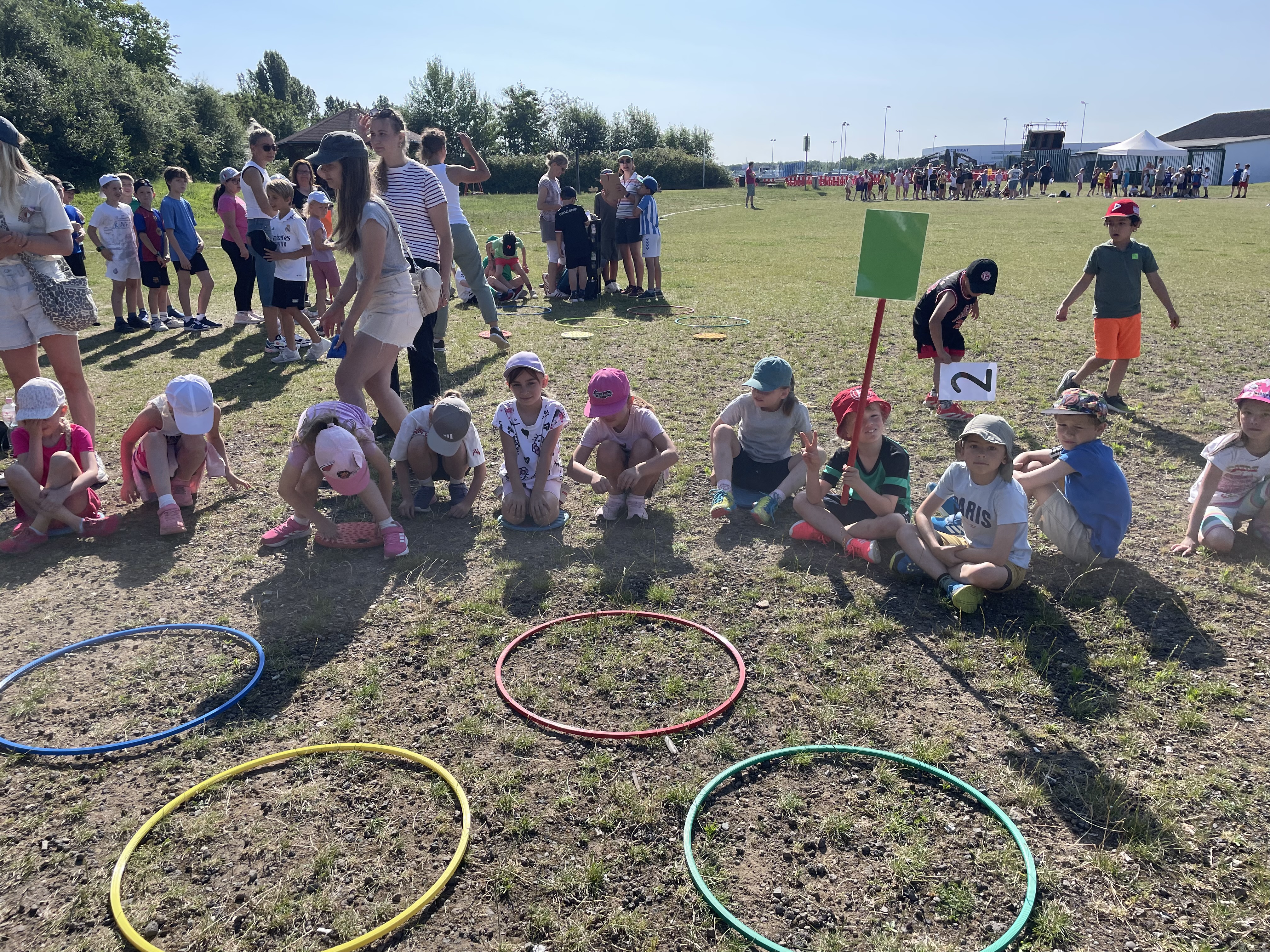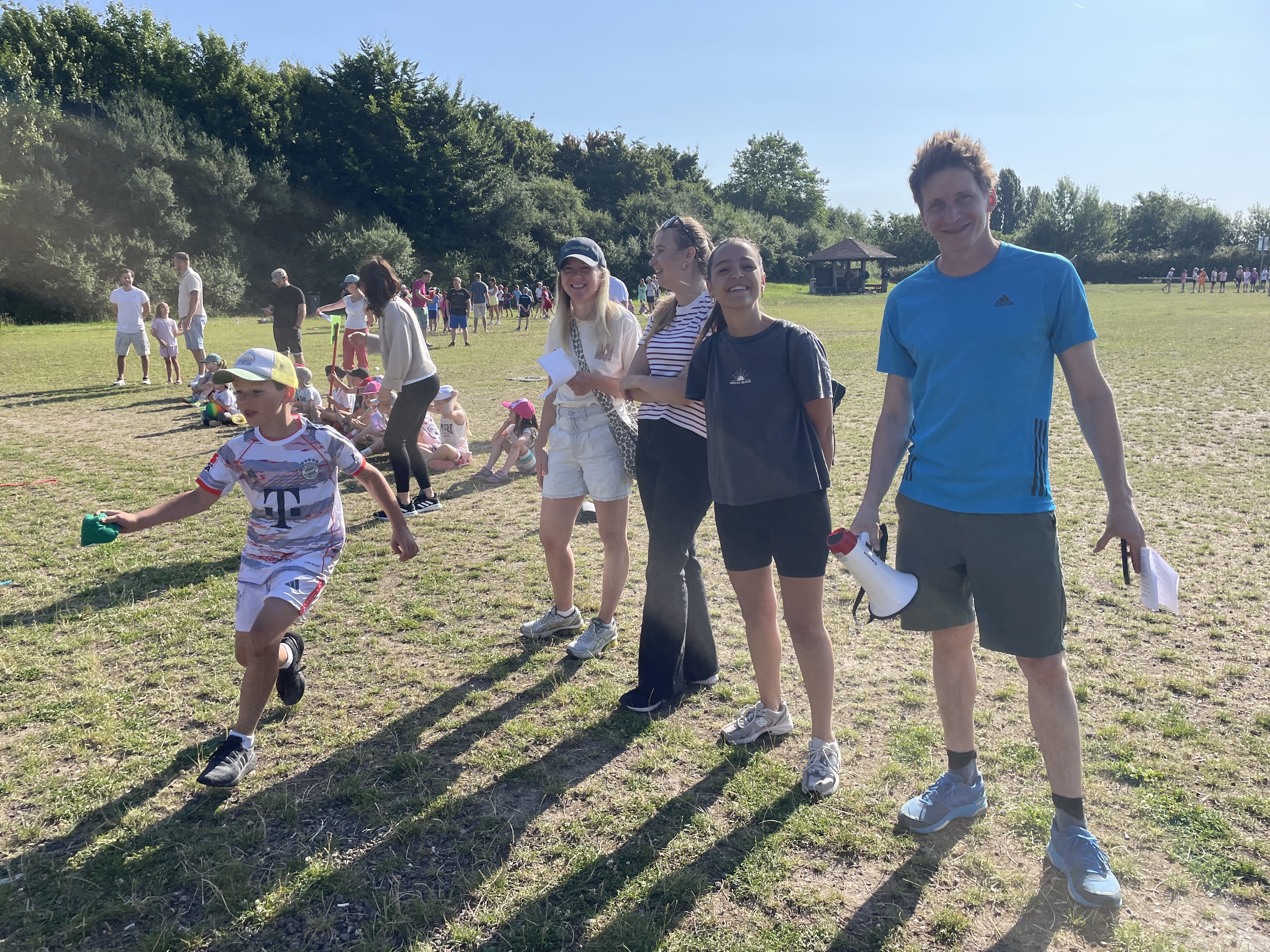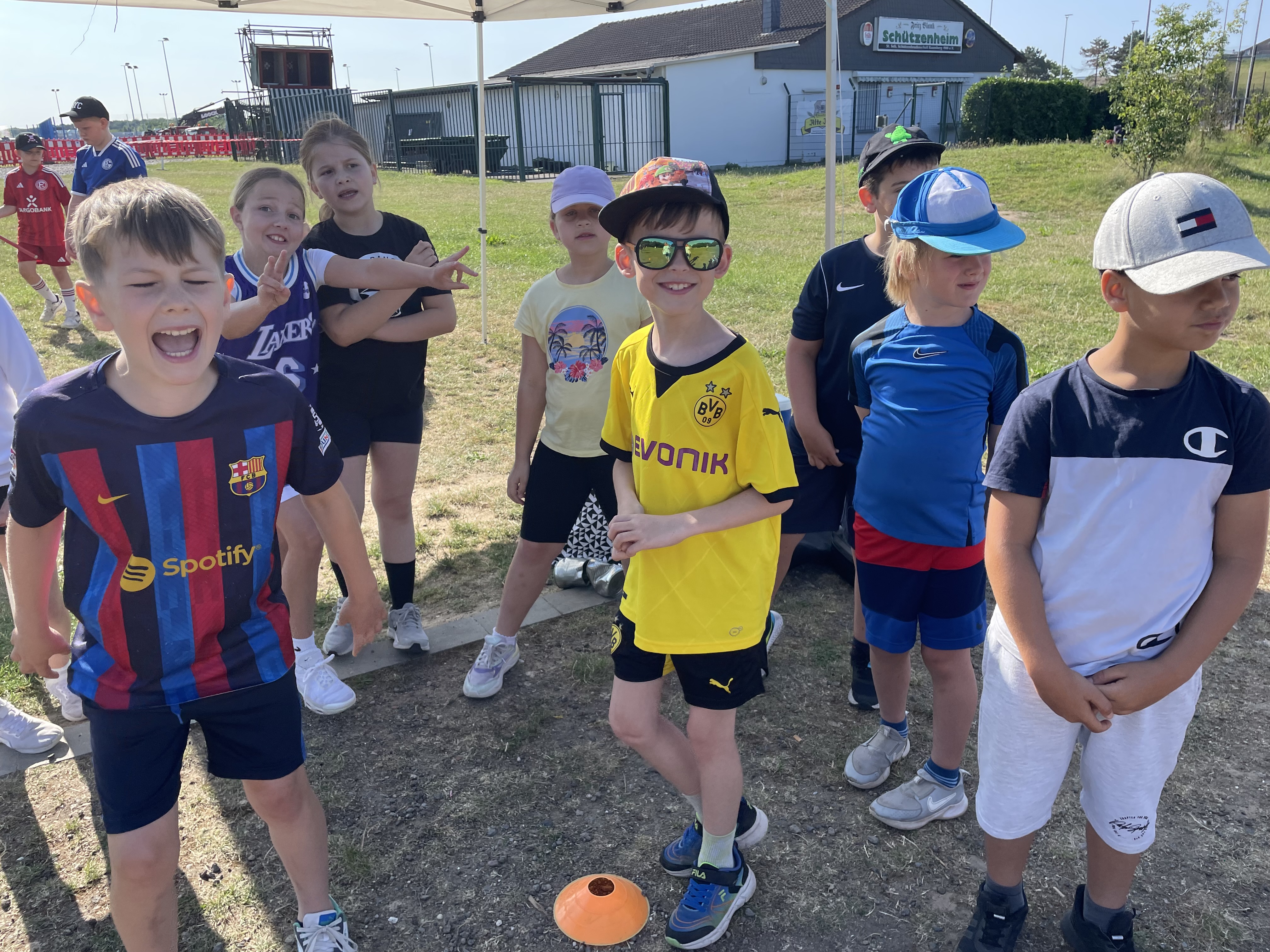 An einem schönen, sonnigen Freitag im Juni trafen sich die Kniprodinis auf dem Schulhof für das diesjährige Sportfest unter dem Motto: „Höher, schneller, weiter – im Team sind wir stark.“ Sie versammelten sich nicht in ihren Klassen, sondern in jahrgangsgemischten Gruppen. Nach einer kurzen Kennenlernrunde in der Gruppe und einer Begrüßung durch Frau Hibel ging es dann los zur Bürgerwiese. Dort angekommen, wurden die Stationen, die die fleißigen Sportlehrer*innen und Eltern geplant und aufgebaut hatten, bestaunt. Die Gruppen suchten sich gemeinsam einen Pausenplatz und es ging los mit einem Aufwärmprogramm. Nicht mehr lange warten, und schon begannen die Spiele. Mit viel Power und Teamgeist spielten die Gruppen gegeneinander Wurfstaffel, Zielwerfen, Dosengolf und Froschsprung. Das war ganz schön anstrengend und die Kniprodinis mussten sich danach in der Pause erst einmal richtig stärken. Im Anschluss ging es in die zweite Runde der Spiele: Ausdauerlauf, Flaschentransport, Schubkarre und Ballstaffel standen auf dem Programm. Die Temperaturen stiegen an und es wurde schon etwas beschwerlicher. Jedoch ließen sich die Kniprodinis nicht aus dem Konzept bringen: Mit Teamgeist, gegenseitigem Anfeuern und Bejubeln meisterten alle Gruppen die Spiele. Zum Schluss ging es müde, aber glücklich zur Schule zurück. Eine Gewissheit steht fest: Die Kniprodinis haben das Motto des Sportfestes definitiv eingehalten.